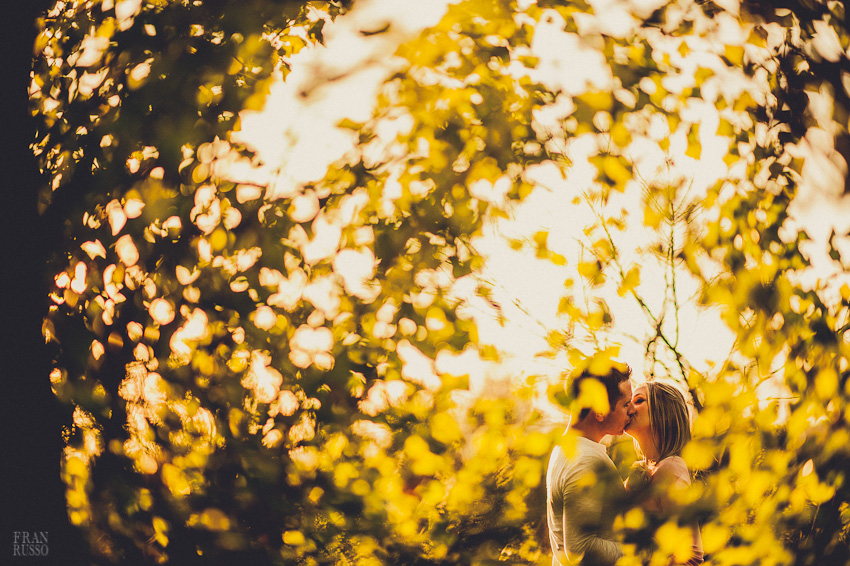 Bueno segun mi analisis tecnico (no uso acentos para escribir porque mi note es extranjera y ponerlos es un quilombo), decia, segun parece y ya lo dijeron es un 85 a gran abertura, buena composicion, foto simple, contraluz y follaje adelante desenfocado, hasta ahi todos estamos de acuerdo, bueno el color no es un problema, eso se trabaja. Pero el plus a la foto esta en el imperceptible efecto que le agrego al follaje, ese sutil efecto circular que se ve en las hojas y que ayuda a centrar la atencion en los novios. Bueno hay muchas maneras de consegurlo, pero para mi duplico la imagen, la movio ligeramente de manera circular y le dio un modo de fusion tipo luz suave o aclarar, modulo la intensidad, tal vez un ligero desenfoque gaussiano, mascara y preservo los novios, donde el efecto no se ve, ni tampoco en las hojas que estan sobre las caras y sobre las cabezas de los novios